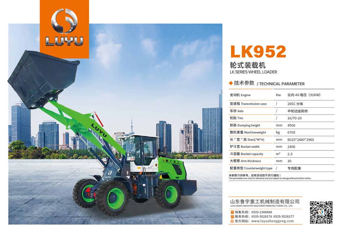 Lu Yu heavy loader series of products, are the best choice of the domestic and international best quality ?accessories, reliable quality, in line with the needs of human nature unique fuel nozzle guide set, oiling is simple, easy to centralized grease ?Fine pipe design, rationalization of the pipeline layout, beautiful and practical, easy to check and repair ?Bucket, automatic flat, reduce the fatigue of the driver, single pump shunt, with priority sensing steering system, energy saving ?Single lever control, reduce driving fatigue and improve work efficiency, four wheel clamp disc brake safety and reliability ?Design, small turning radius, load sensing coaxial flow amplification, light, flexible and efficient. ?Ideal operating speed and a 40 degree shift angle significantly improve work efficiency ?International standard noise reduction technology, to protect the driver's physical and mental health, to ensure that the work efficiency ?Industry leading cooling system to ensure continuous operation at high temperature.